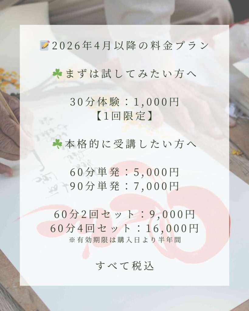 突然のお知らせとなってしまい大変恐縮ですが、このたび、昨今の物価高騰などを背景に、2026年4月1日より、当相談室のご受講料金を以下の通り改定させていただくこととなりました。